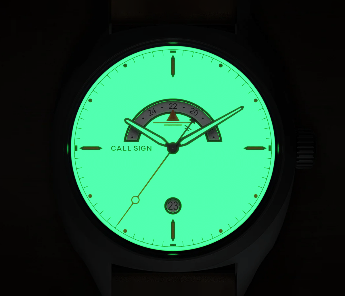X1 Grade Super-LumiNova® is the highest-performance luminous material available, engineered to deliver brighter, longer-lasting afterglow than standard Super-LumiNova. Compared to lower grades and other lume options, X1 maintains visibility deep into the night, retaining up to 60% more brightness after extended hours in darkness. It’s the benchmark choice for premium timepieces where legibility and reliability matter most. This lume comes standard on all Call Sign timepieces.